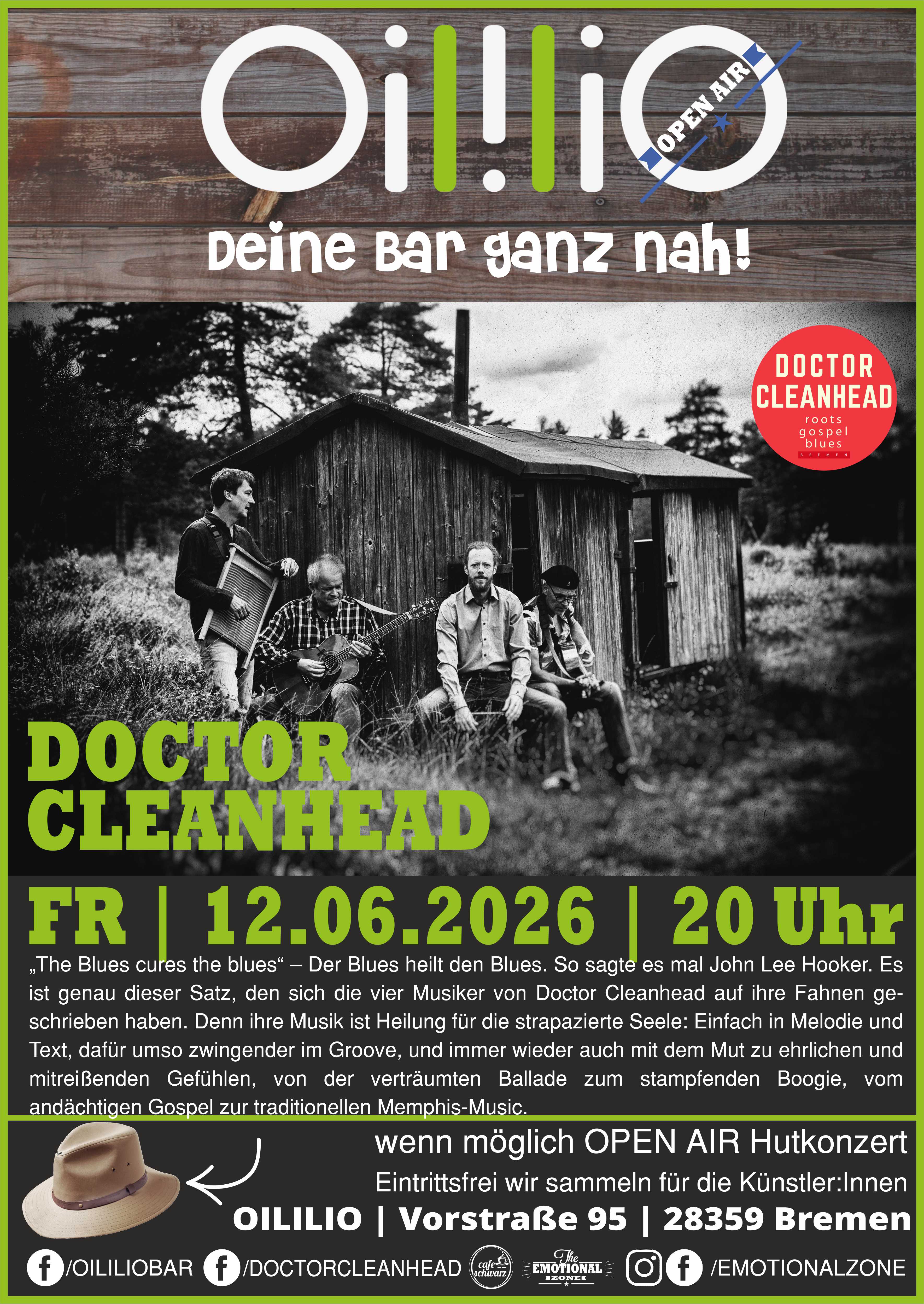 Das OILILIO – Deine Bar ganz nah! präsentiert gemeinsam mit The.Emotional.Zone und MusicConnectsAll, www.cafe-schwarz.tv, Rausgegangen.de live und open air (bei schlechtem Wetter natürlich Innen!) von 20 bis 22 Uhr, wobei…, das Ende des Konzertes wird maßgeblich vom Publikum mitbestimmt! DOCTOR CLEANHEAD „The Blues cures the blues“ – Der Blues heilt den Blues. So sagte es mal John Lee Hooker. Es ist genau dieser Satz, den sich die vier Musiker von Doctor Cleanhead auf ihre Fahnen geschrieben haben. Denn ihre Musik ist Heilung für die strapazierte Seele: Einfach in Melodie und Text, dafür umso zwingender im Groove, und immer wieder auch mit dem Mut zu ehrlichen und mitreißenden Gefühlen, von der verträumten Ballade zum stampfenden Boogie, vom andächtigen Gospel zur traditionellen Memphis-Music. Die Band-Mitglieder pflegen bewusst die „musikalische Schlichtheit“: Mehrstimmige Gesänge sowie urwüchsige, nicht-elektrische Instrumente wie Harmonika, Mandoline, Cajon und Resonator-Gitarre. Das Programm reicht von Leadbelly und Muddy Waters bis zu Fats Domino und Janis Joplin, wobei die Stücke auf das Wesentliche reduziert und auf den Punkt gebracht werden. „Cleanhead“-Musik eben, frei von intellektuellen Störfeldern. Was die Band-Mitglieder aber nicht daran hindert, zwischen den Musikstücken interessante Details zur Blues-Geschichte und ihren schillernden, aber oft auch vergessenen Repräsentanten zu erzählen. Denn Blues heißt ja nicht zuletzt, dass dort Musik von Menschen für Menschen gemacht wird. singen zu hören. Die Musiker von DOCTOR CLEANHEAD sind: Jörg Zittlau Gitarre/Resonator/Gesang Rainer Hoveling Gitarren/Gesang Michael Höptner Harmonika/Gesang/WB Timo Jahnke Cajon/Percussion Alle Konzerte sind Hutkonzerte, das bedeutet Sie als Gast entscheiden, welchen Betrag Sie für angemessen halten und in den Hut geben. Hierfür gibt es keine Regel, Sie allein entscheiden. Als kleiner Tipp: Musiker schaffen Ihre Werke, proben und kommen zu uns an den Ort! Musiker lieben „Scheinwerfer“ und jeder Betrag ist – ebenso wie Sie – ist willkommen! Wir akzeptieren Cash oder EC-Cash! Musikerbewerbungen (bitte immer umfassend und vollständig und kein „Hey, ich würde gern mal spielen“) dann an info@emotional.zone #oililio #bremen #zusammenbremen #lokaleleidenschaft #hornlehe #multikulti #regional #saisonal #livemusik #gemeinsamezeit #emotionalzone #cafeschwarztv #rausgegangenbremen #doctorcleanhead Best OililiO Live im Oililio wird präsentiert von unseren Agenturpartnern Musicconnectsall und Emotional Zone, der Veranstaltungsplattform Rausgegangenbremen und wenn Ihr Interesse an guter Musik und den Geschichten hinter den Musikern und Musikerinnen habt, dann werft mal einen Blick auf cafe-schwarz.tv, denn dort können sich Musiker im Interview und mit 6 Live gespielten Songs präsentieren und vorstellen!