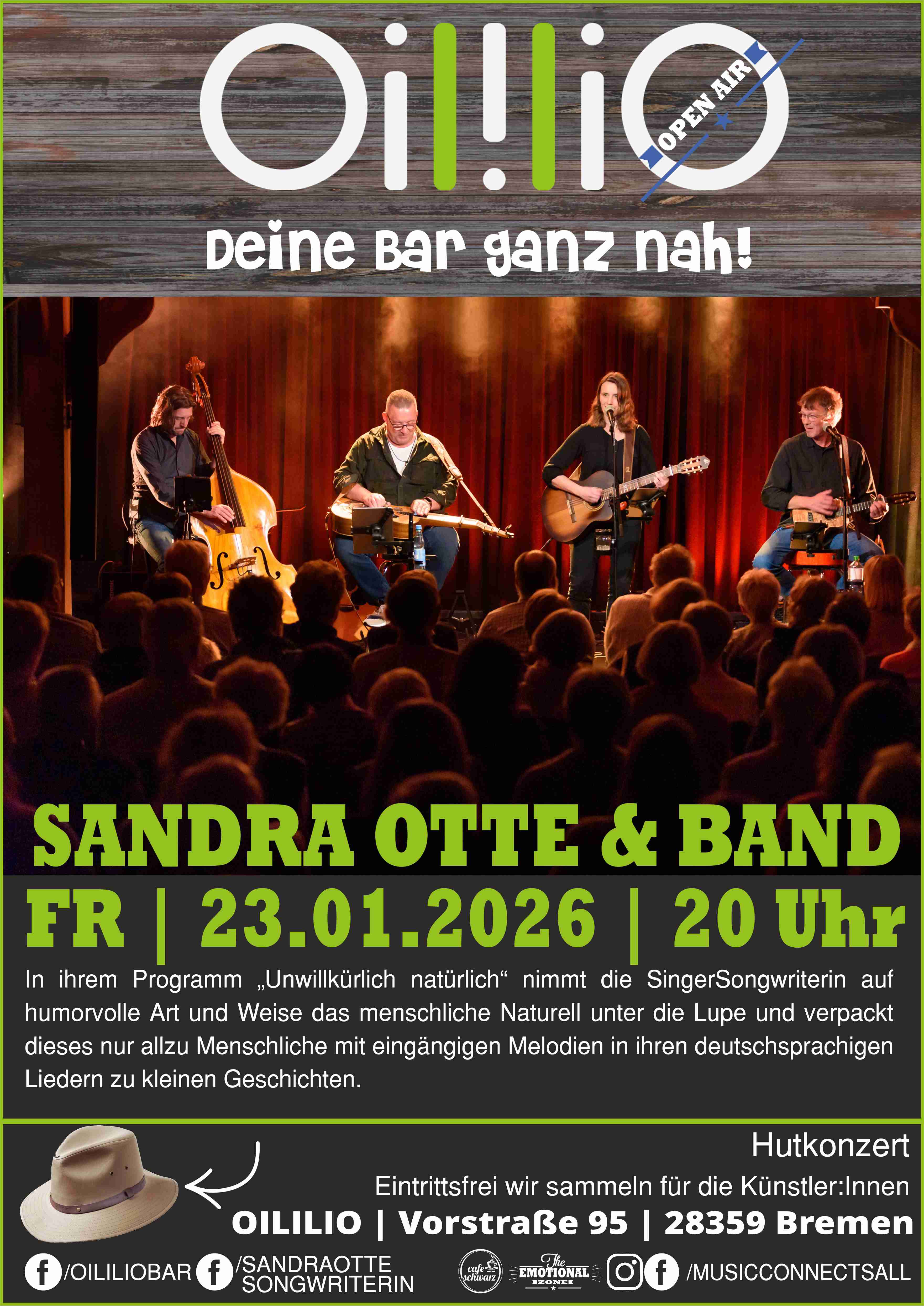 Das OILILIO – Deine Bar ganz nah! präsentiert Best OililiO gemeinsam mit The.Emotional.Zone, www.cafe-schwarz.tv, DowntownIslandRadio und Rausgegangen.de live und open air (bei schlechtem Wetter natürlich Innen!) von 20 bis 22 Uhr, wobei…, das Ende des Konzertes wird maßgeblich vom Publikum mitbestimmt! SANDRA OTTE & BAND Lieder, wie sie das Leben schreibt! Die Nachbarin, die über alles und jeden Bescheid weiß, der Name, der einem partout nicht einfallen will, oder der Besserwisser, der zu allem seinen Senf dazu gibt… Mit Witz, Charme und warmer, klarer Stimme nimmt die SingerSongwriterin Sandra Otte in ihrem Programm „Unwillkürlich natürlich“ das menschliche Naturell unter die Lupe und verpackt das nur allzu Menschliche in ihren deutschsprachigen Texten mit eingängigen Melodien zu kleinen Geschichten. Schmunzeln ist hierbei sicher vorprogrammiert, denn alles, worüber sie in ihren Liedern singt, hat wohl nahezu jeder so oder so ähnlich schon erlebt. 2009 schrieb die Sängerin ihre ersten eigenen deutschsprachigen Lieder, denen dank ihres Wortwitzes immer schon eine Prise Humor innewohnten. Dies feilte sie über die Jahre immer weiter aus, beleuchtet dabei mit feiner Beobachtungsgabe die kleinen, amüsanten Wahrheiten unseres Miteinanders und schlüpft hierbei mit einem Mienenspiel, das Seinesgleichen sucht, gerne in die Rolle der im Songtext besungenen Person. Mit ihrem im Juni 2018 erschienenen Debüt-Album „BOAH!“ positionierte Sandra Otte ihre Musik im Bereich des deutschen Pop / Pop-Chansons, die mal rockiger, mal sanfter und mal mit BigBand-Bläsersatz arrangiert ist. Die bittersüße Ballade „Für dich“ aus diesem Album schaffte es im Dezember 2018 sogar unter die Top 20 der deutschen Liederbestenliste (www.liederbestenliste.de) auf Platz 15. Seitdem wurden Lieder aus ihrem Album schon auf Radiosendern wie SR3 oder Deutschlandradio gespielt. In der Bremer TV Talkshow „Budder bei die Fische – Der Ter Veen Talk“ und auch auf Radio Bremen 4 in der Malte Völz Show trat Sandra Otte mit je zweien ihrer Lieder live auf und wurde dort mit Reinhardt May verglichen, dessen Texte häufig auch bissig seien, sie ihm durch die charmante Art aber nie übel genommen werden würden. So ginge es einem mit den Liedern von Sandra Otte auch, hieß es. Mit ihrem Programm „Unwillkürlich natürlich“ , bei dem sie sich mit ihrer Gitarre mal beschwingt, mal balladesk im Dreivierteltakt oder mit federleichtem Fingerpicking begleitet, holt sie ihr Publikum auf wunderbar natürliche und zugewandte Art und Weise ab, versetzt es in Momente des „Sich-Wiedererkennens“ oder gar des „Ertapptseins“, des Schmunzelns und des Genießens. Alles in allem verspricht es einen amüsanten, heiteren und warmherzigen Konzertbesuch, bei dem wir in die Welt unseres zwischenmenschlichen Alltages abtauchen. Alle Konzerte sind Hutkonzerte, das bedeutet Sie als Gast entscheiden, welchen Betrag Sie für angemessen halten und in den Hut geben. Hierfür gibt es keine Regel, Sie allein entscheiden. Als kleiner Tipp: Musiker schaffen Ihre Werke, proben und kommen zu uns an den Ort! Musiker lieben „Scheinwerfer“ und jeder Betrag ist – ebenso wie Sie – ist willkommen! Wir akzeptieren Cash oder EC-Cash! Musikerbewerbungen (bitte umfassend und vollständig und kein „Hey, ich würde gern mal spielen“) dann an info@emotional.zone #oililio #bremen #zusammenbremen #lokaleleidenschaft #hornlehe #multikulti #regional #saisonal #livemusik #gemeinsamezeit #emotionalzone #cafeschwarztv # rausgegangenbremen Best OililiO Live im Oililio wird präsentiert von unseren Agenturpartnern Musicconnectsall und Emotional Zone, dem Bremen Radio Downtownisland, der Veranstaltungsplattform Rausgegangenbremen und wenn Ihr Interesse an guter Musik und den Geschichten hinter den Musikern und Musikerinnen habt, dann werft mal einen Blick auf cafe-schwarz.tv, denn dort können sich Musiker im Interview und mit 6 Live gespielten Songs präsentieren und vorstellen!