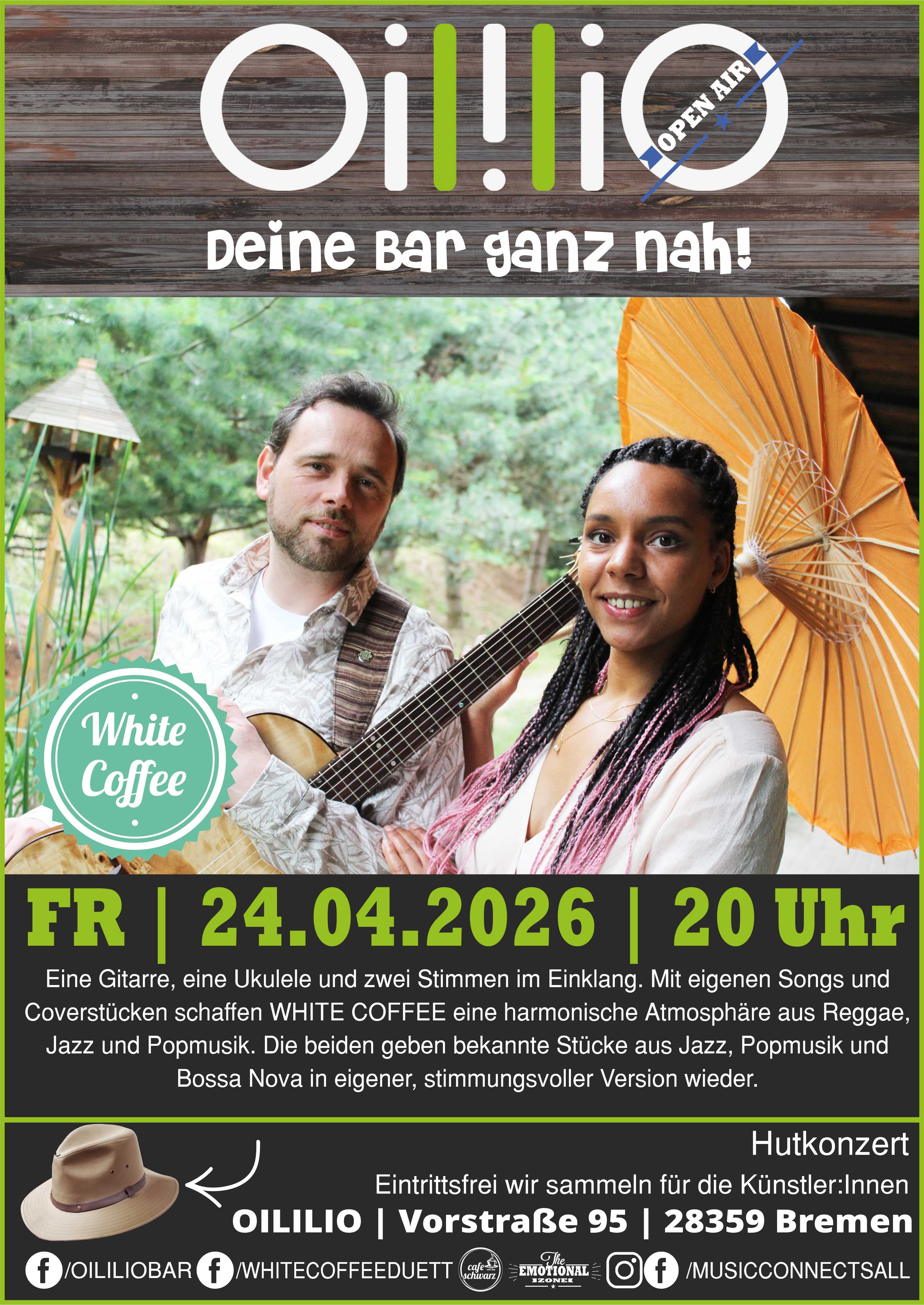 Das OILILIO – Deine Bar ganz nah! präsentiert gemeinsam mit The.Emotional.Zone und MusicConnectsAll, www.cafe-schwarz.tv, Rausgegangen.de live und open air (bei schlechtem Wetter natürlich Innen!) von 20 bis 22 Uhr, wobei…, das Ende des Konzertes wird maßgeblich vom Publikum mitbestimmt! WHITE COFFEE Ein leckeres Getränk zu jeder Jahreszeit – oder ein akustischer Genuss. Eine Gitarre, eine Ukulele und zwei Stimmen im Einklang. Mit eigenen Songs und Coverstücken schaffen WHITE COFFEE eine harmonische Atmosphäre aus Reggae, Jazz und Popmusik. Jenny und Andy Grove geben bekannte Stücke aus Jazz, Popmusik und Bossa Nova in eigener, stimmungsvoller Version wieder. „Es macht unheimlich viel Spass, die Menschen mit Musik den Alltag vergessen zu lassen.“ Jenny und Andy Grove geben bekannte Stücke aus Jazz, Popmusik und Bossa Nova in eigener, stimmungsvoller Version wieder. Es geht Ihnen hauptsächlich darum, mit ihrer Musik die Wertschätzung der kleinen Dinge im Leben hervorzuheben. White Coffee wollen Menschen zusammenbringen, unterhalten und zum Träumen einladen. Im Juli 2016 ist ihre erste EP „Celine“ mit eigenen Songs erschienen. Jennifer Grove – Lead Vocals / Ukulele Andreas Grove – Gitarre / Backing Vocals Alle Konzerte sind Hutkonzerte, das bedeutet Sie als Gast entscheiden, welchen Betrag Sie für angemessen halten und in den Hut geben. Hierfür gibt es keine Regel, Sie allein entscheiden. Als kleiner Tipp: Musiker schaffen Ihre Werke, proben und kommen zu uns an den Ort! Musiker lieben „Scheinwerfer“ und jeder Betrag ist – ebenso wie Sie – ist willkommen! Wir akzeptieren Cash oder EC-Cash! Musikerbewerbungen (bitte immer umfassend und vollständig und kein „Hey, ich würde gern mal spielen“) dann an info@emotional.zone #oililio #bremen #zusammenbremen #lokaleleidenschaft #hornlehe #multikulti #regional #saisonal #livemusik #gemeinsamezeit #emotionalzone #cafeschwarztv #rausgegangenbremen Best OililiO Live im Oililio wird präsentiert von unseren Agenturpartnern Musicconnectsall und Emotional Zone, der Veranstaltungsplattform Rausgegangenbremen und wenn Ihr Interesse an guter Musik und den Geschichten hinter den Musikern und Musikerinnen habt, dann werft mal einen Blick auf cafe-schwarz.tv, denn dort können sich Musiker im Interview und mit 6 Live gespielten Songs präsentieren und vorstellen!